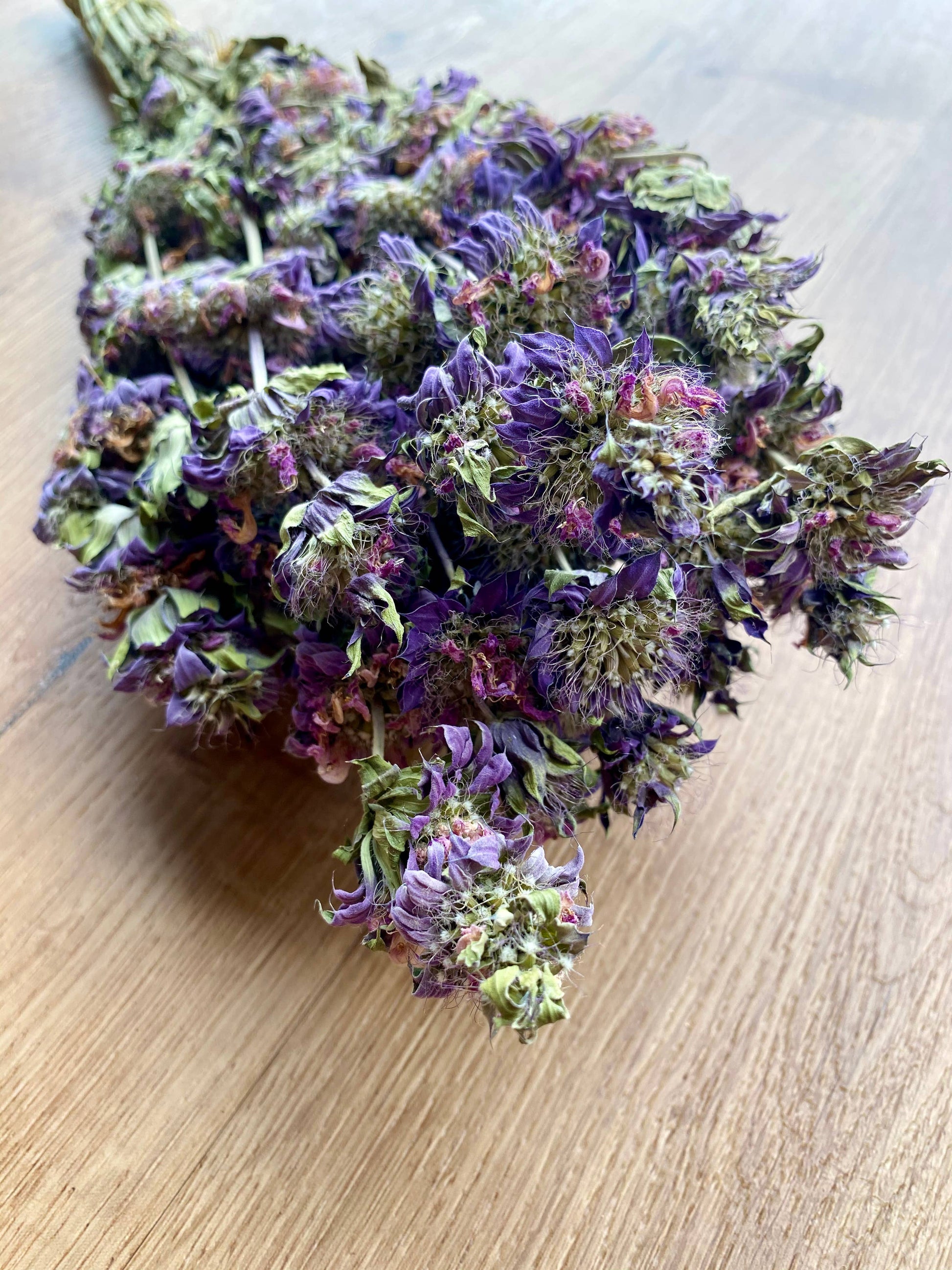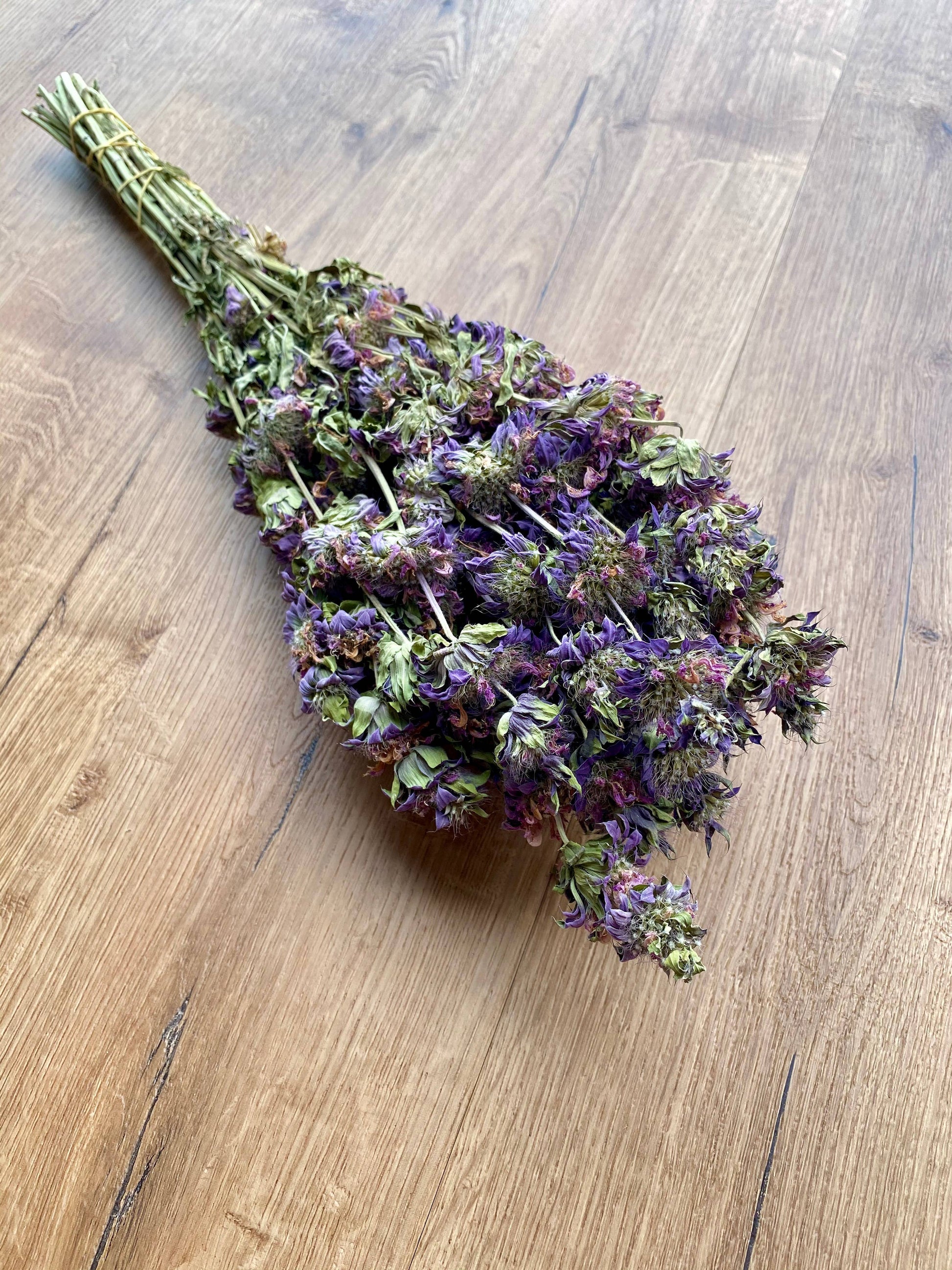 Lemon Mint features bushy bunches of long, green, spike stems supporting light, purple-pink blooms. The product emits a nice mild minty aroma. The Lemon Mint is dried using ambient air with no added preservatives or coloring. This item will retain the same color, appearance, and integrity dried as when fresh for several years particularly when displayed out of direct sunlight. This item is not promoted to be used for human or animal consumption.